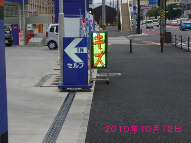 10月12日の火曜日にあるGSでカラフルに光っているフルカラータイプのLED看板、電光掲示板を見かけました。これが少し離れてデジカメで撮影した写真で、天気は曇りでした。