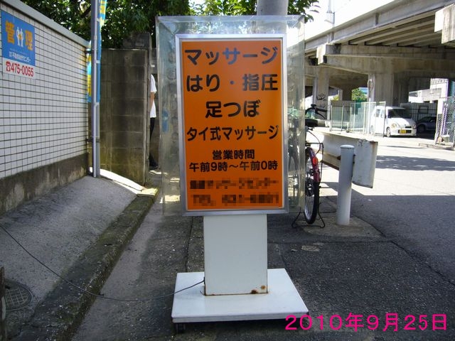 上記の写真は、タイ式マッサージ店というのが、マンションの1Fにオープンした時のもので、写真では黄色っぽくなっていますが、オレンジ色に黒文字でお店の営業品目や営業時間や屋号や電話番号が書かれてあります。